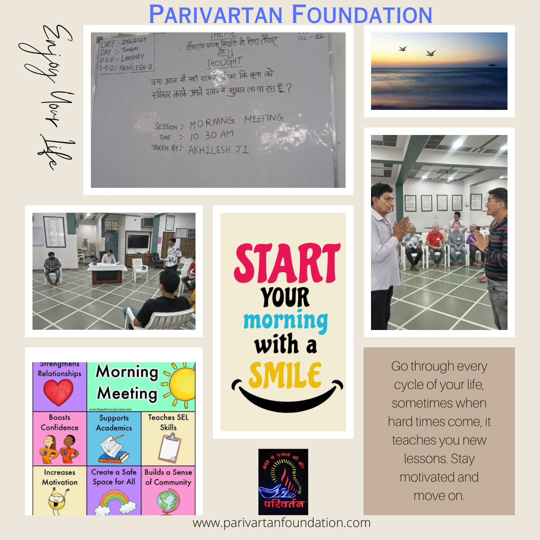 Parivartan is a unique world which symbolizes the right of faith, right intentions, right speech, right action, right livelihood, right effort, right mindfulness, right meditation, here in Parivartan we mix and match different types of personalities and mould them to become productive member of the society. Parivartan has a single objective that is to restore the addict, drug free life and make him capable to become a productive and socially acceptable in the society. We have no bias to caste, creed, community or social class.